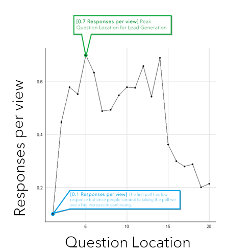 Once someone has answered that first question things look a lot better. Question five gets as high as 0.7 responses per view. This is a great location to enter a lead question as we expect a drop off in responses to occur soon after.