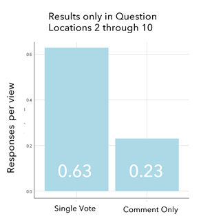 When looking at drop-off later in the survey (questions 2–10), conversion when using the single-vote question increases significantly, while ‘Comment’ questions question type conversion holds steady.