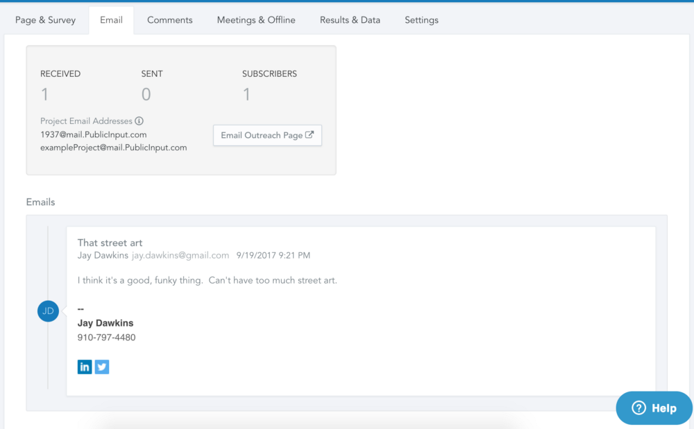 The PublicInput.com servers process any incoming emails and parses them to your project management page, where they’re included in your overall engagement summary: