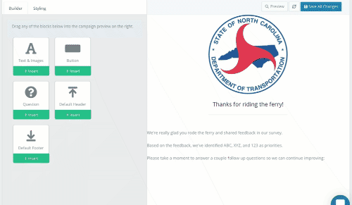 These things were front of mind when we chose to invest in building an integrated email communications toolkit into Public Input. Here’s a quick illustration of building an email with an embedded follow-up question: