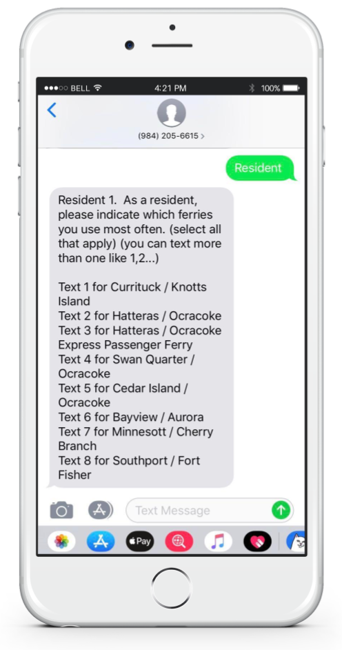 NCDOT recently integrated text messaging surveying into their community engagement strategy for a survey for every passenger ferry in the state. This is one tactic for meeting resident where they are and giving the same experience as taking a survey on a project website, or via mailer.