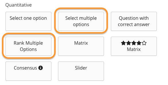 If you’re trying to narrow down several options to a few, the Select Multiple Options question is the way to go. At this point in the process, you’re probably just looking to identify the top three or four options.