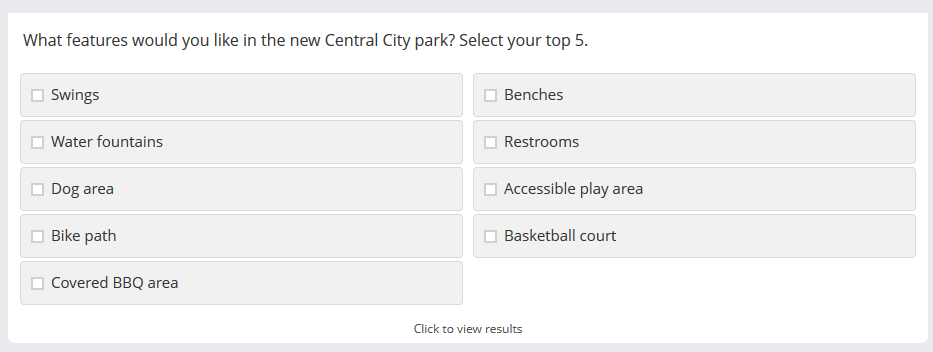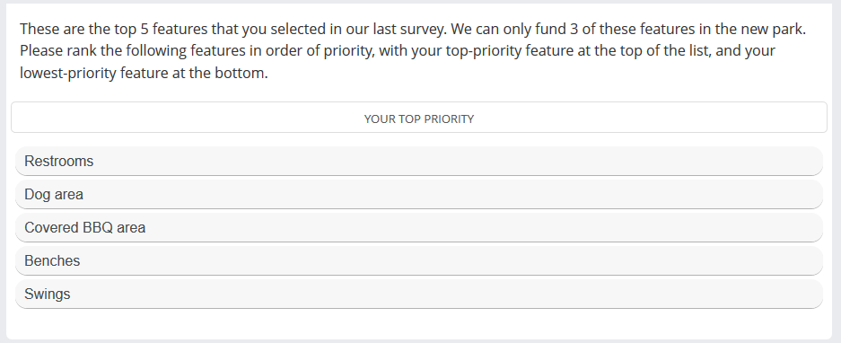 For example, let’s say you’re building a new park. You want to understand what features the community wants, but you don’t know how many features you can fund. So you come to the community with a list of 10 possible features and ask them to select their top five options.