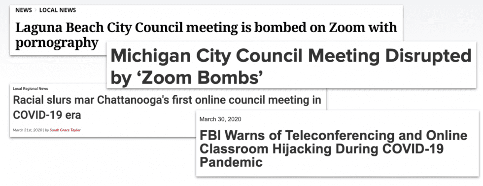 These concerns reflect the nature of our rapidly-changing environment. Just two weeks ago, most organizations were just beginning to discuss what to do about public meetings. Now an entire wave of failed efforts are showing the serious shortcomings of off-the-shelf conferencing tools as a replacement for public meetings. Here are just a few of the recent stories – we’re seeing dozens every day: