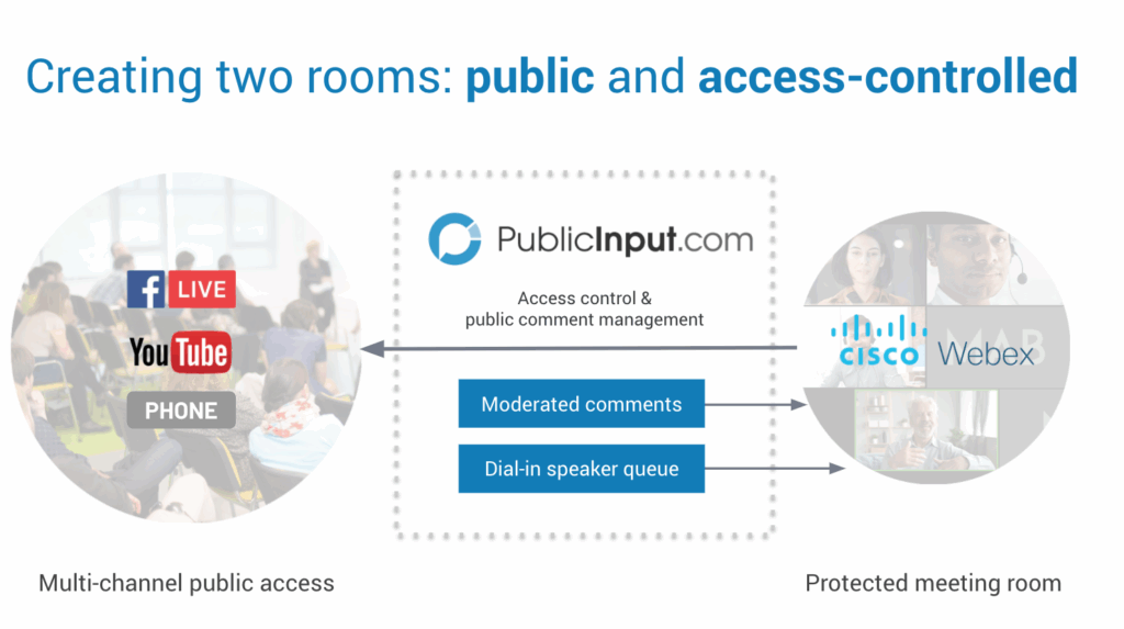 You can take control of the meeting and prevent hijacking by non-meeting presenters by hosting your meeting in a live stream. For example, you can live stream a WebEx meeting using Facebook live. Once you have a Facebook live video URL, simply plug it into your PublicInput.com meeting to create a secure virtual meeting, publicly broadcasted on an engagement page. This “Russian doll” method allows for open access while also protecting from hijacking or “conference bombing.” Multiple presenters can take part remotely, while receiving questions and comments via a comment box. This approach also allows you to moderate comments while simultaneously adhering to records laws (FOIA) by keeping a record of comments and questions in relation to your live meeting.