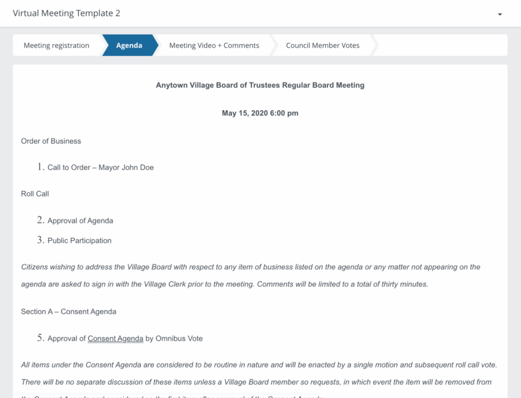 Note: If you have a prewritten agenda, it’s best practice to include that information as part of the project associated with your meeting. If you are a PublicInput.com partner, you can simply copy + paste that info into a content block on your virtual meeting engagement page, or drop in as a PDF.