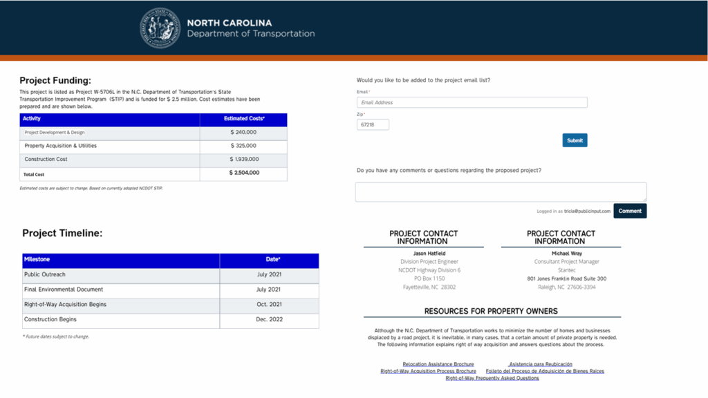 Open and transparent communication is one important aspect to building and maintaining trusted relationships with the community. Providing opportunities to share information about active projects as well as ways for the public to respond with feedback helps build this trust. Active project pages that include informative information (out to the public) and request feedback (in to the agency) is key.