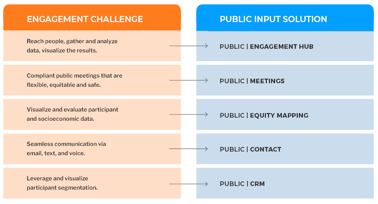 Unified community engagement increases efficiency and supports inclusive, data-driven decision-making. When paired with traditional tactics like in-person meetings, a complete community engagement platform accelerates the development of public trust and enables governments to be compliant with open government laws and community inclusion standards.