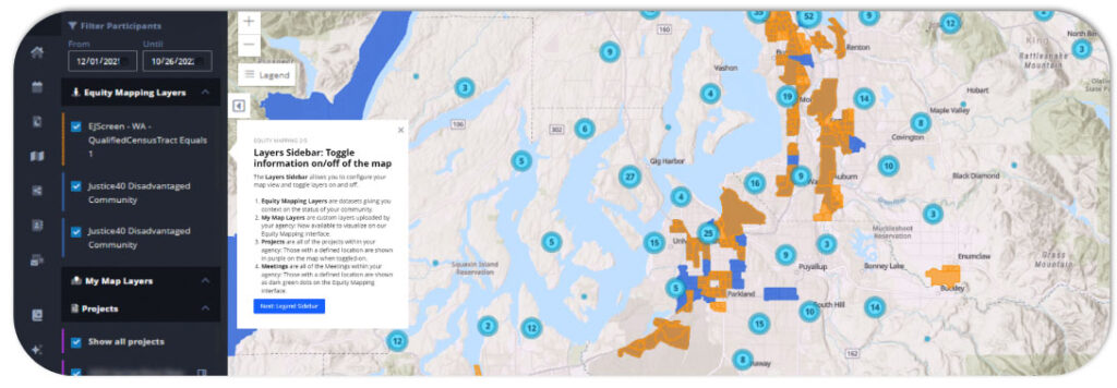 PublicInput Equity Mapping helps state and local governments visualize participant data overlaid with custom environmental and socio-economic data specific to your community or project area.