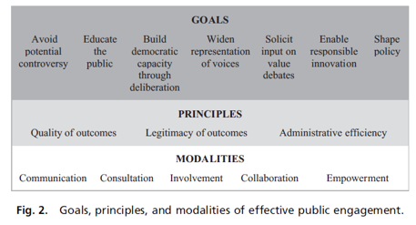 The framework {figure 2} delineates a total of seven goals, ordered loosely based on the extent to which diverse publics might meaningfully exert influence on policy or scientific enterprise itself.