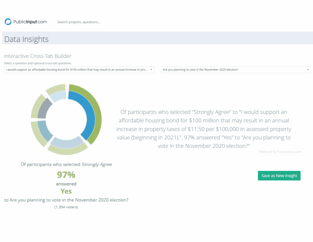Above Image Caption: The PublicInput dashboard provides project managers with both a quantitative and illustrative view of the project activity.One of the most important insights generated demonstrated that 97% of respondents who “strongly agreed” with continuing to support the initiative, also reported their intention to vote in the upcoming election.