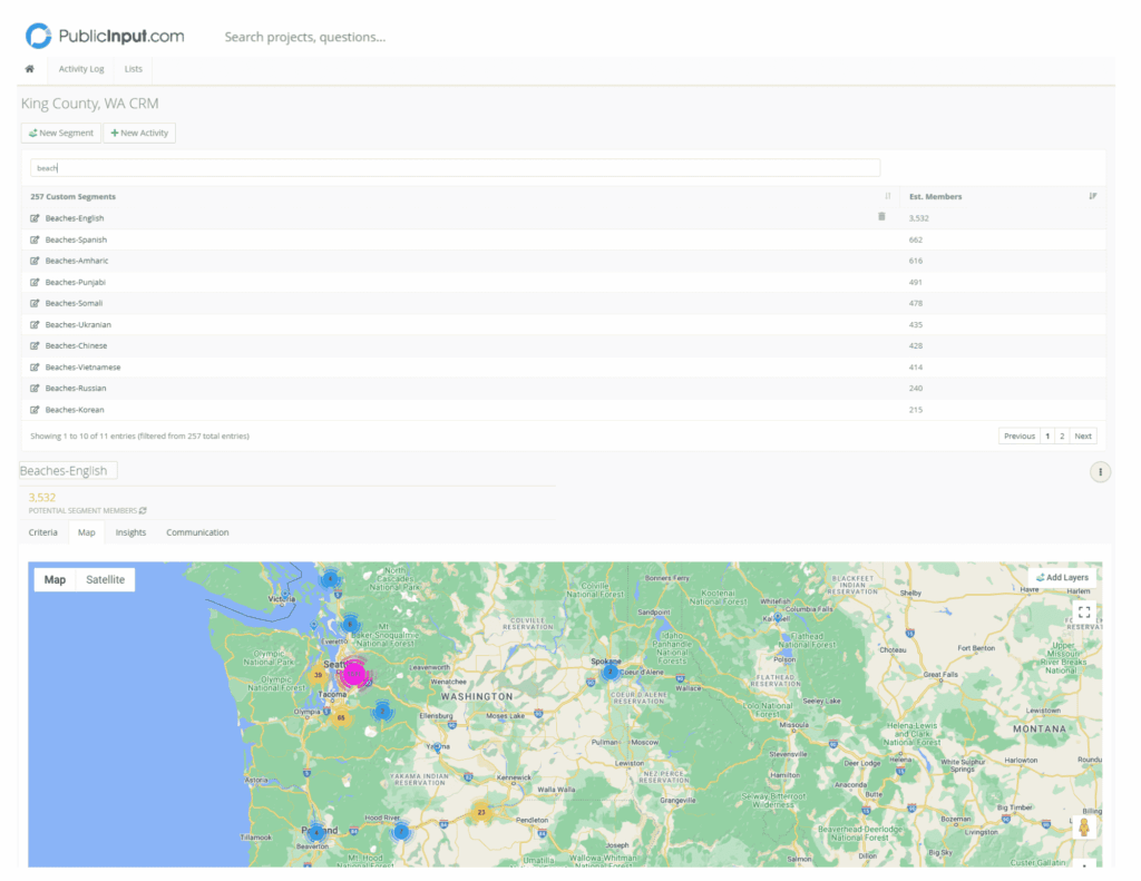 Using the PublicInput community engagement software, King County launched its “Beaches Survey” to the community with language accessibility targeted at the following 10 languages: