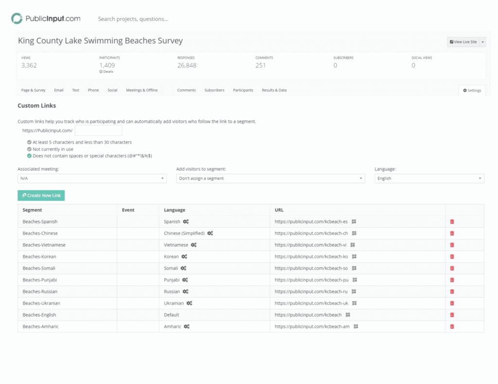 The PublicInput CRM automatically captures participants using custom links in an associated segment for future outreach and communication purposes.