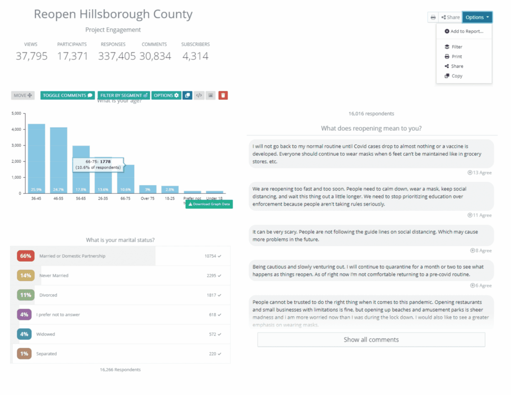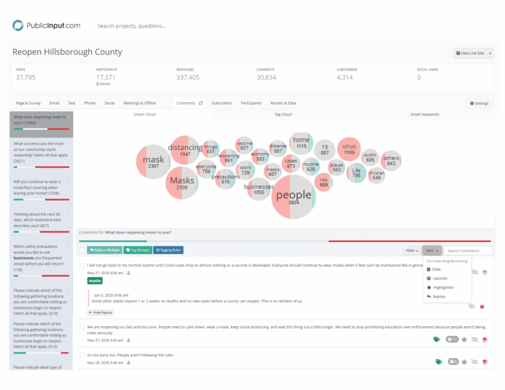Using the PublicInput Comment Analysis, CRM and Dynamic Reporting features, the County was able to quickly and easily analyze over 17k survey submissions and 30k comments collected from Hillsborough community members.