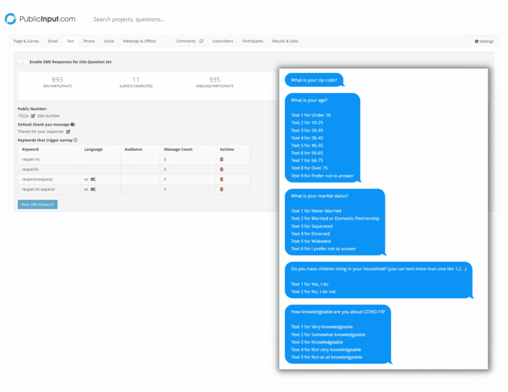 Above Image Caption: PublicInput SMS Text surveys are customizable with over 100 languages options available.