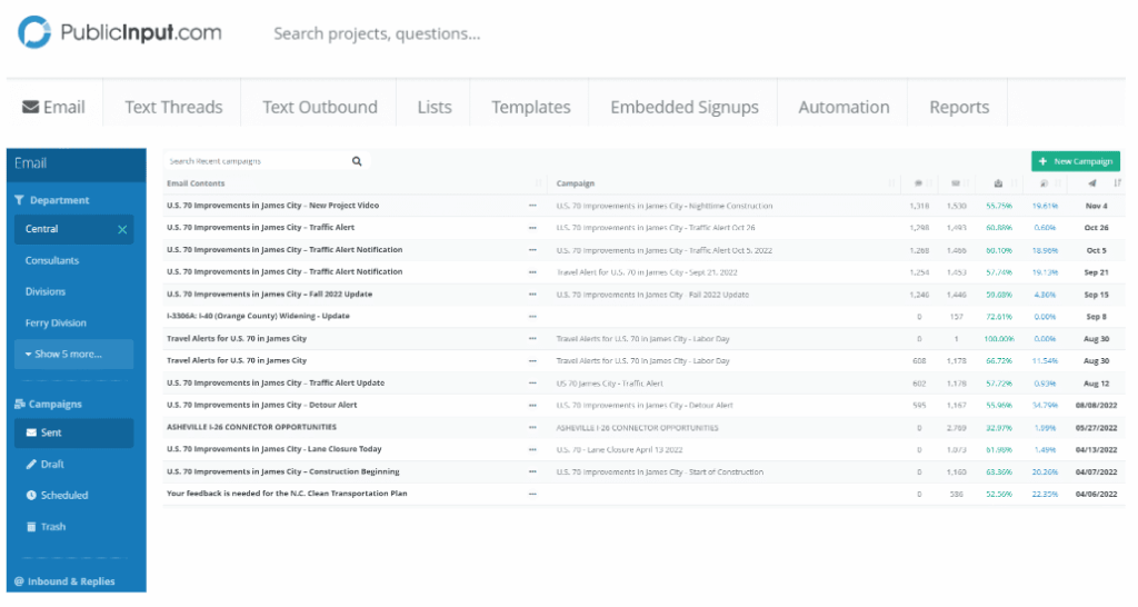PublicInput provides a central hub to manage public involvement and ensure each firm or user works from the same performance benchmarks. This approach also means each project has data and contacts that grow inside your resident database for use in future outreach.