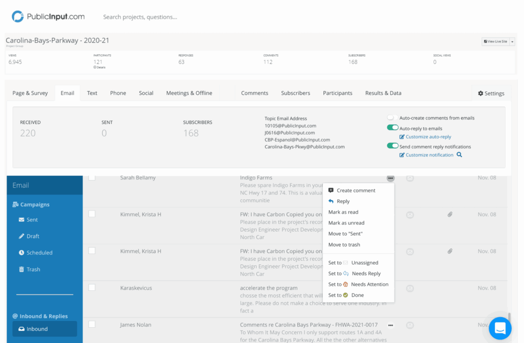 Whether it is NEPA, Title VI, or other laws that mandate the consideration of public comments and a documented response, PublicInput is built to manage and document the entire spectrum of public involvement formats. That includes in-person and virtual meetings, email, online surveys, phone, text messages, and social media – all from one secure platform.