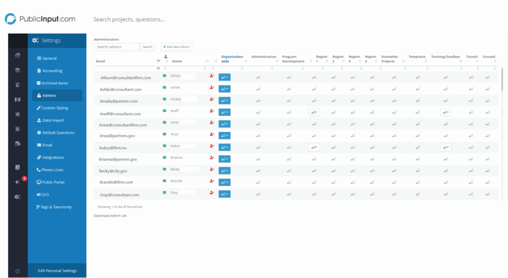 PublicInput administrative access management can be tailored to the way you already work. With discreet access controls at the organization, division, or project level, the platform supports simplified and secure collaboration and records retention across all your teams and projects.
