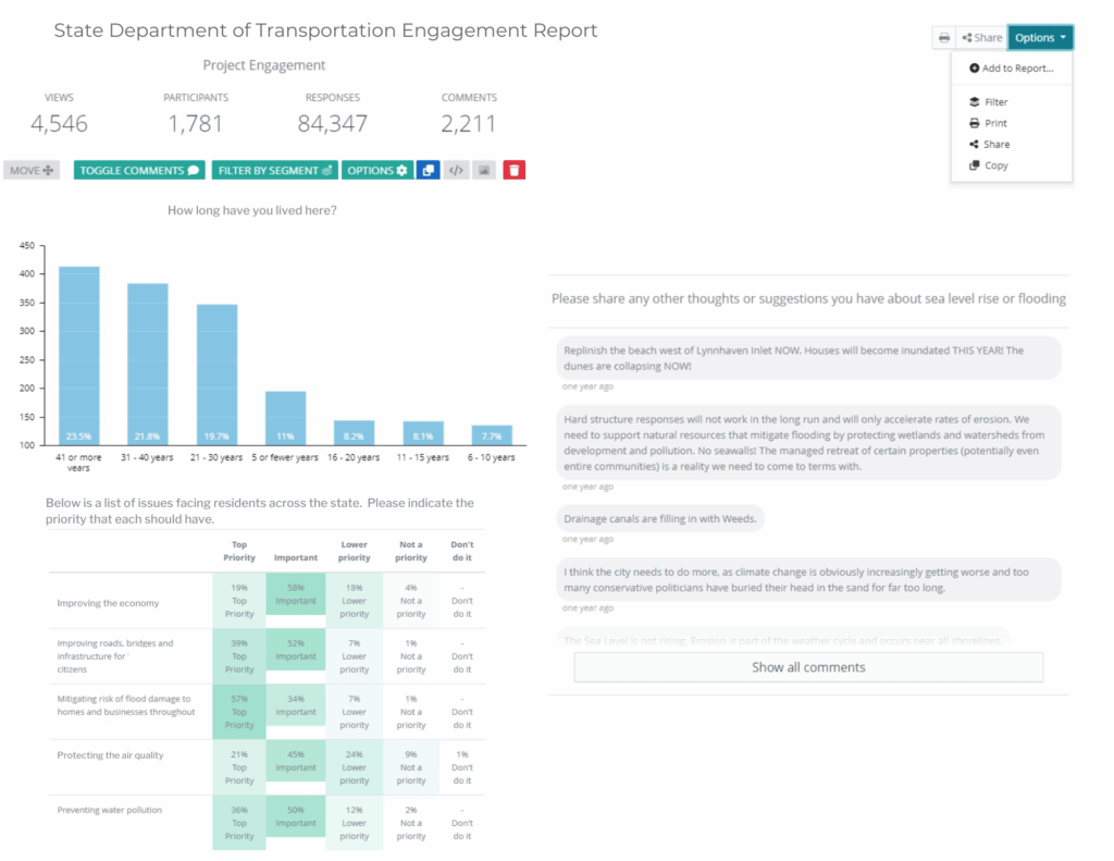 - Filter and analyze responses and comments from specific disadvantaged communities and target areas