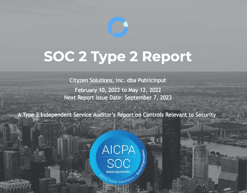 PublicInput is proud to have attained SOC 2 Type II data security compliance in accordance with the American Institute of Certified Public Accountants (AICPA) standards.