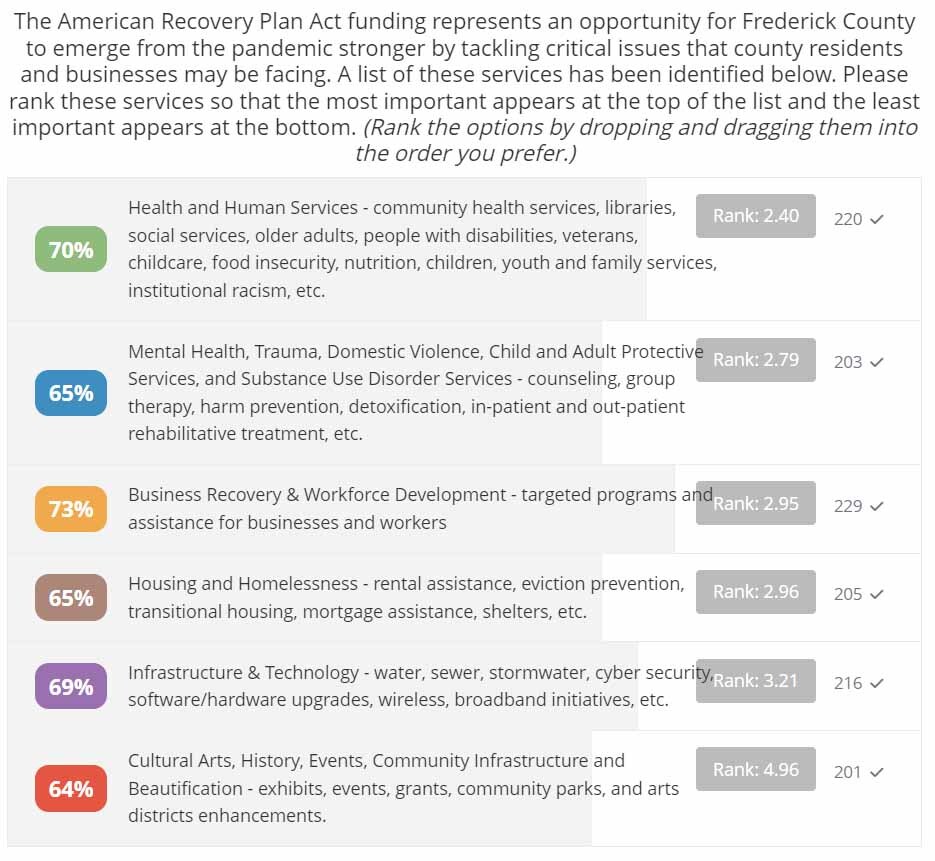 Critically, Frederick County directly involved residents in the annual budget prioritization and planning process. By creating the “Frederick County Budgeting home,” a micro-site on the PublicInput platform, residents could learn about the budgeting process and provide feedback on specific topics at their convenience via a mixed-mode approach (online, email, phone, in-person).