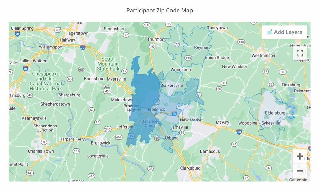 Above Screenshot: Frederick County Spanish Speaking Participant Map by Zip Code