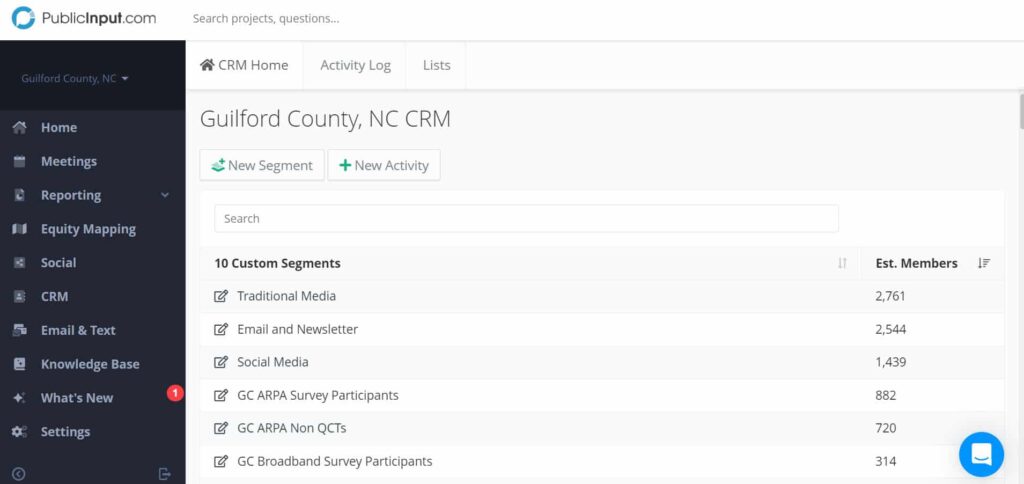 Guilford County, NC uses the PublicInput CRM to manage engaged residents by topic and interest area.