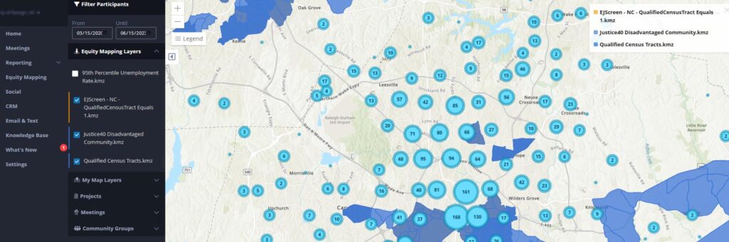 With Equity Mapping enabled, every project or meeting you conduct within the PublicInput platform will result in a new data layer. These are arranged in alphabetical order on your dashboard, and can be toggled on or off, just like the other layers. Our system uses general geographical location data to put your participants on the map, allowing you to compare and contrast your participation data with EJScreen, Justice40, and QCT data.