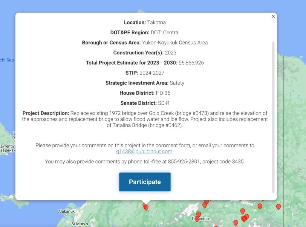 In Alaska DOT&PF’s online portal, all located projects were assigned a latitude and longitude on an interactive map. PublicInput also supports line and shape locations, as well as a searchable interface for projects that do not have a location.
