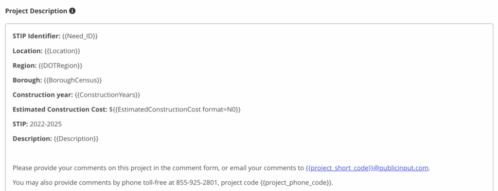 The template included merge fields for key project attributes like estimated cost, region, and congressional and senate districts. The template also included PublicInput fields for phone and email input options.