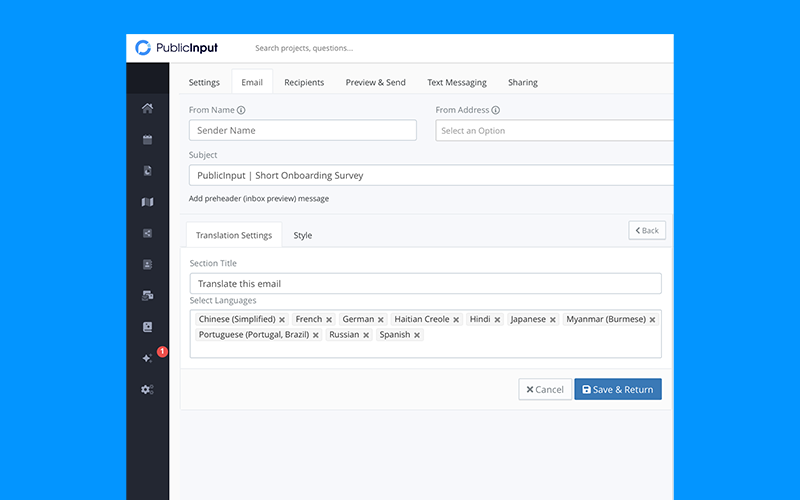 PublicInput has launched enhanced multilingual email capabilities within the Email Campaign Builder. This new addition, known as “Translation,” is now accessible to all PublicInput clients with Email tab access.