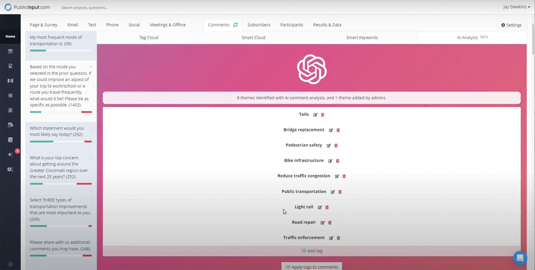 GPT Comment Analysis offers the ideal blend of AI and human oversight. For example, if your agency uses consistent tags across all projects, you might want to change an auto-generated tag of “roads” to “infrastructure.” You can also manually add tags post-analysis to create more nuance in your comment management.