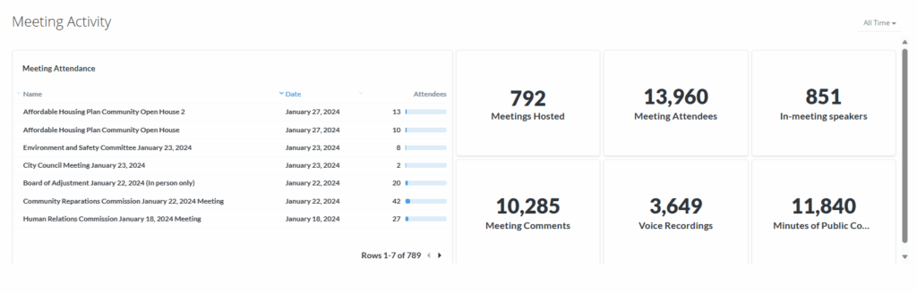 Above Image: The PublicInput admin dashboard provides staff with a quick view of their public meeting analytics.