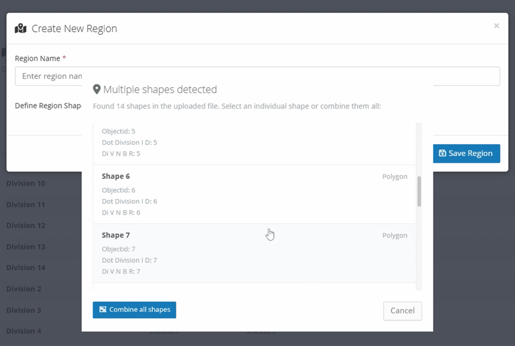The region tool can extract shapes from your existing GIS assets, such as ArcGIS feature services, KML files, or ESRI Shapefile. For example, if you have a file with multiple districts or shapes, you can select a specific shape when creating a region: