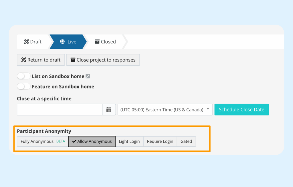 With the PublicInput survey builder easily toggle anonymity settings to collect feedback without revealing participant identities.