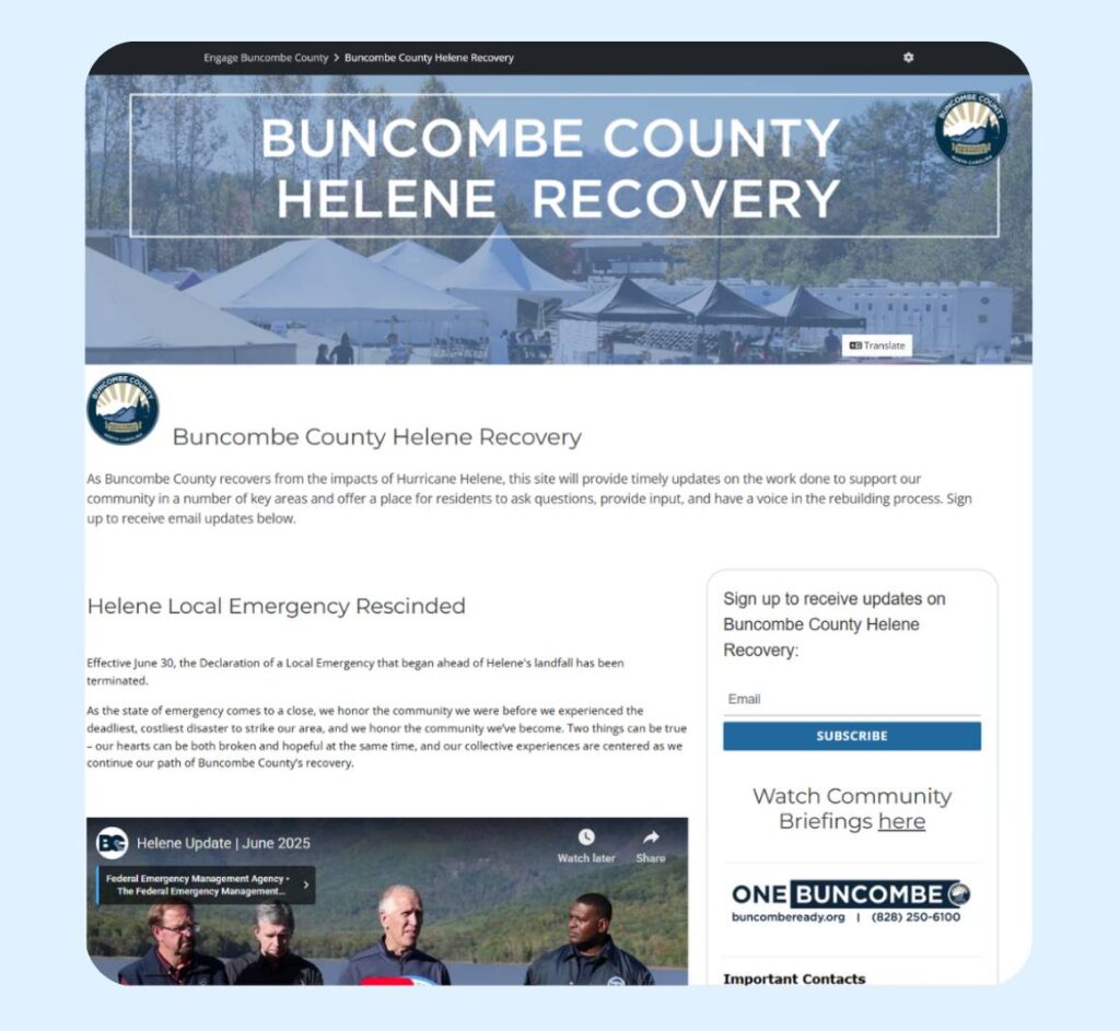Buncombe County used PublicInput as a central hub for recovery communication and engagement through its Buncombe Recovers / Helene Recovery site and the Engage Buncombe portal.