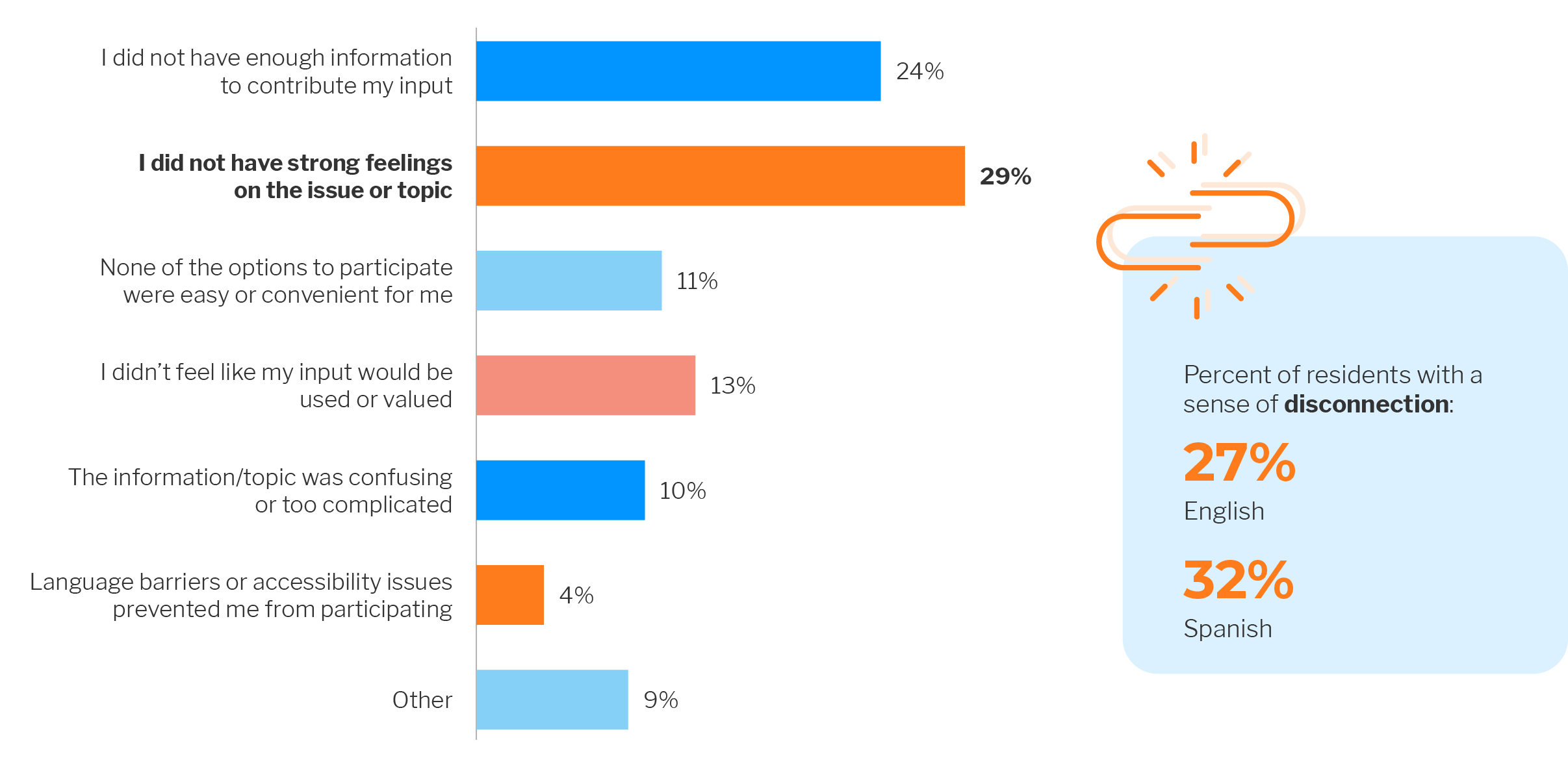 This year’s data shows that 29% of residents didn’t engage simply because they didn’t feel strongly about the issue, while 24% felt they lacked enough information to make an informed decision. These findings point to two key barriers: a sense of disconnection and insufficient information.