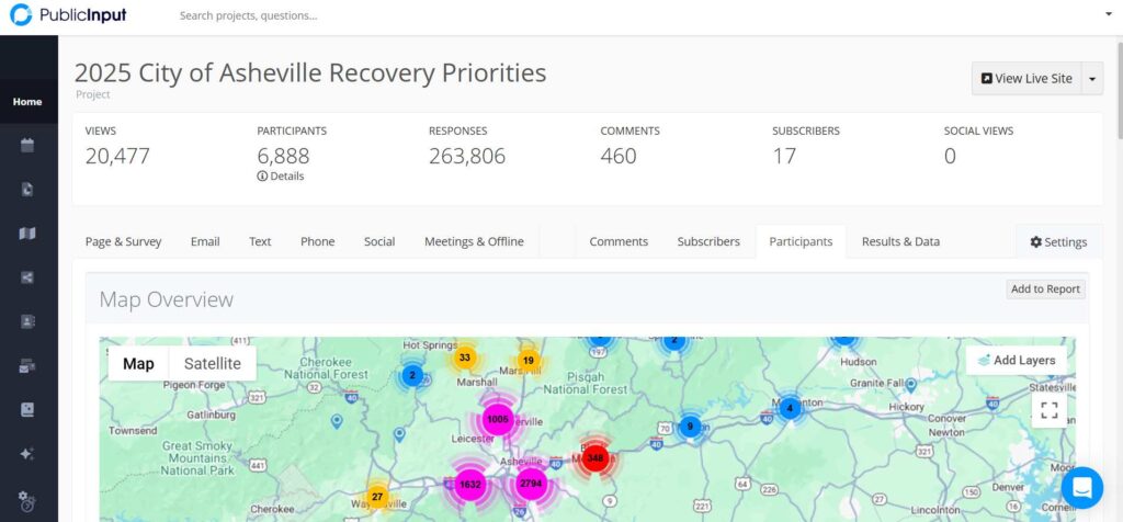 Asheville used the PublicInput platform to power a wide-reaching, community-centered recovery engagement effort. The tools made it easier for city staff to connect with residents, collect feedback, and ensure transparency during a critical time. A variety of multi-channel tools helped make engagement inclusive and accessible, including: