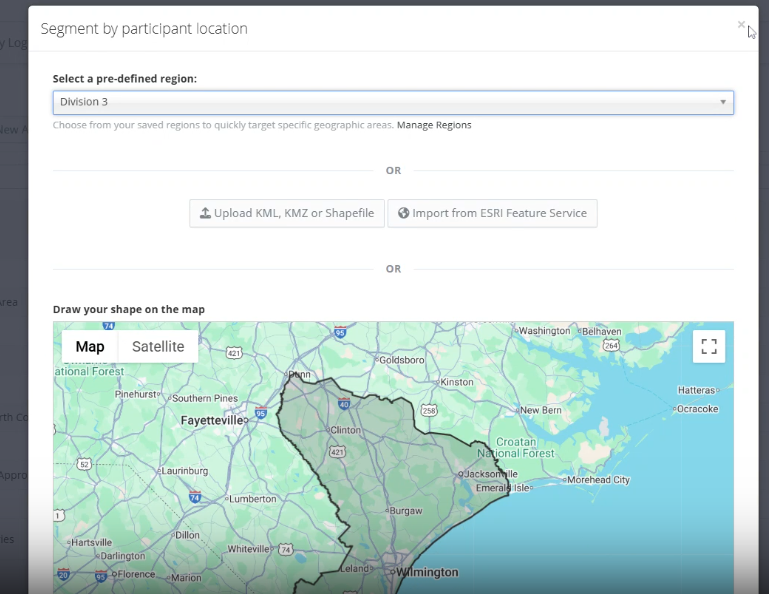 The region tool can extract shapes from your existing GIS assets, such as ArcGIS feature services, KML files, or ESRI Shapefile. For example, if you have a file with multiple districts or shapes, you can select a specific shape when creating a region: