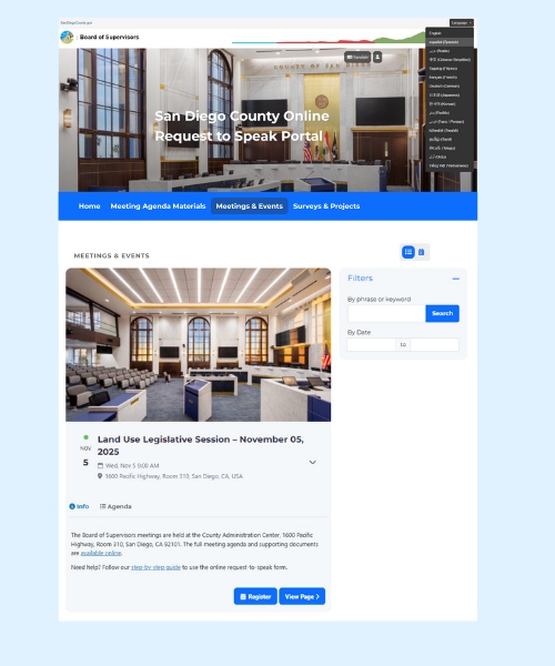 The County launched PublicComment.SanDiegoCounty.gov, a single, user-friendly hub where residents could register to speak, view agendas, and access meeting information—all in one place.