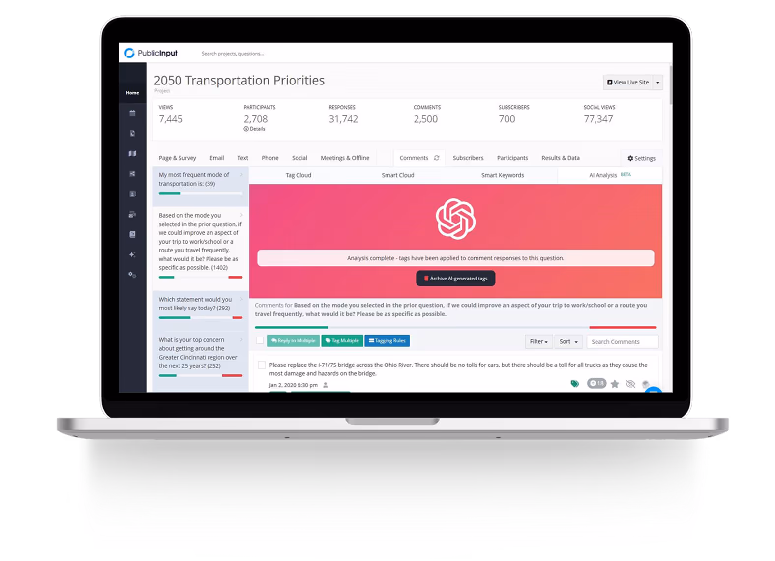 With PublicInput, every comment, question, and suggestion is captured, categorized, and distilled into clear, actionable insights automatically. Lead with confidence, report with clarity, and earn your communities trust by showing them they're being heard.