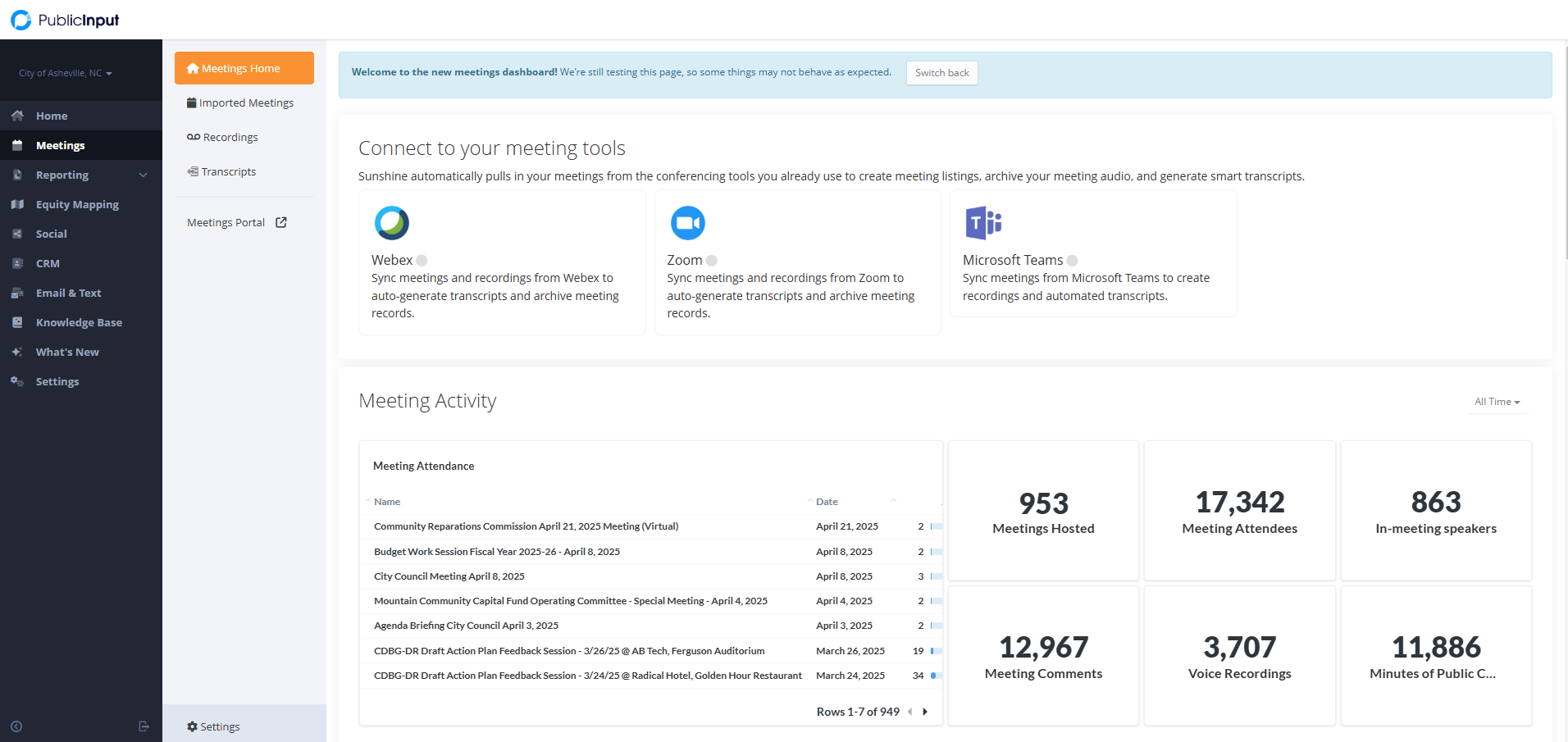 Local governments are under pressure to do more with less, and community engagement often suffers as a result. Without a centralized system, staff juggle manual tasks and scattered tools, leading to fragmented, time-consuming efforts. PublicInput streamlines engagement by bringing departments like planning, communications, public works, and transportation onto one platform. Teams can coordinate outreach, share data, and engage the public with reusable templates, scheduled campaigns, and automated workflows. This unified, proactive approach reduces friction, expands reach through multilingual, multi-channel strategies, and connects with underrepresented communities via digital tools, events, and trusted partners. Real-time dashboards and customizable reports turn public feedback into actionable insights, helping teams track participation, spot trends, and show impact. With integrations like ArcGIS, Salesforce, and Zoom, PublicInput provides a complete, scalable view of engagement in one place.
